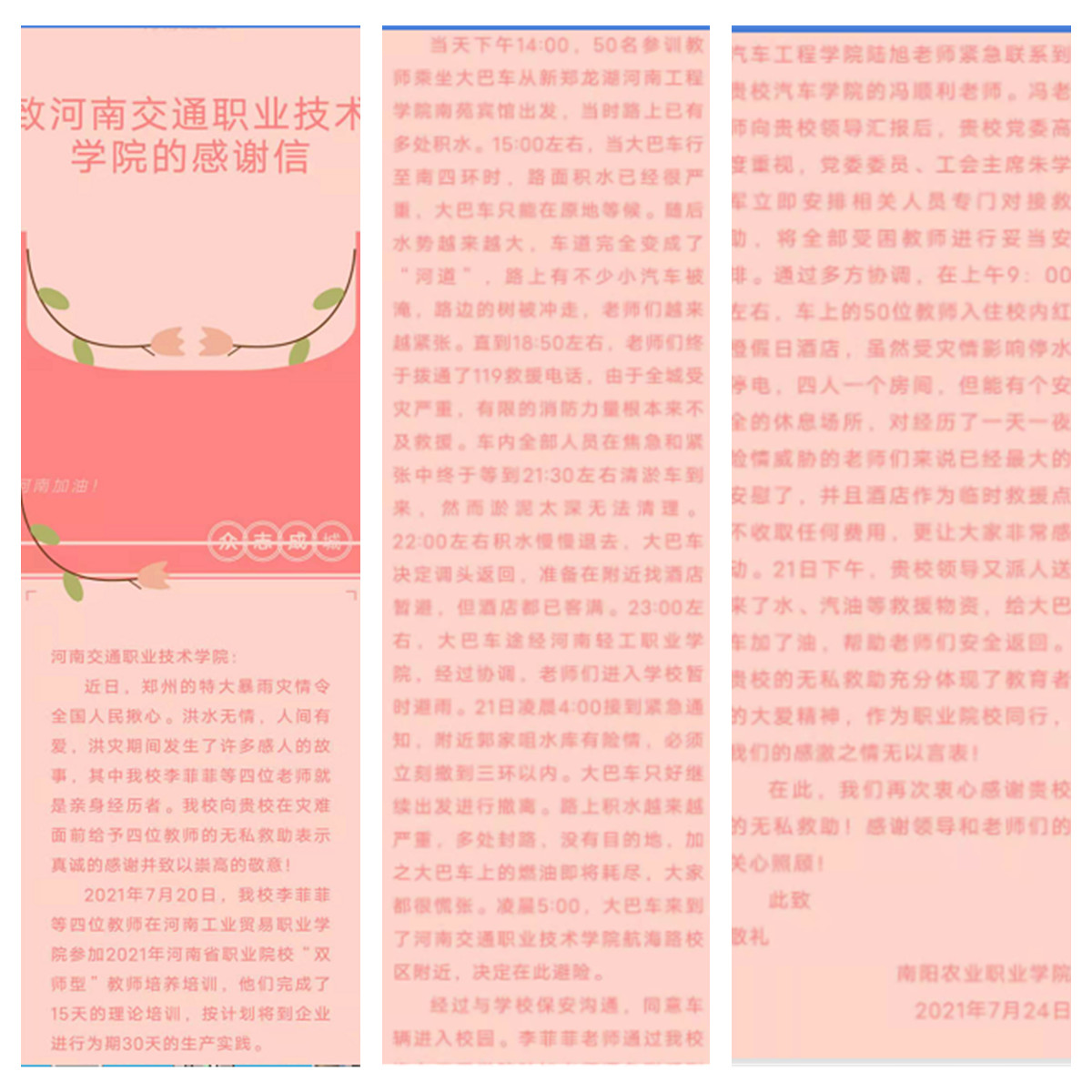 强化宣传教育,全力确保人员安全。学校各部门(单位)第一时间通过微博、微信、短视频等平台,传达习近平总书记对防汛救灾工作的指示精神、传达省委省政府的决策部署和学校党委的要求,推送暴雨洪灾自救指南,提高广大师生的防护意识;发布致河南交院学子及家长们的一封信;宣传推送广大党员和青年师生参加抢险救灾志愿服务的新闻,积极弘扬正能量、唱响交院“好声音”;积极开展在校生特别是校外5000余名实习生安全排查,确定具体位置和安全状况等关键信息,由实习指导教师,加强安全防护宣传教育,确保实习学生人身安全。
