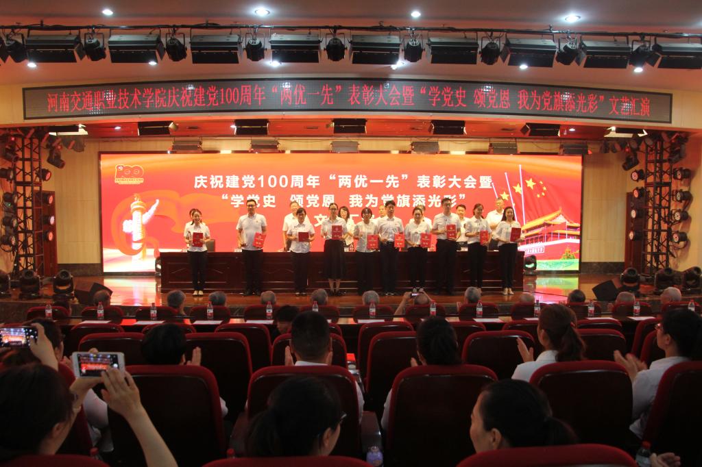 大会首先向党龄50年以上的老党员代表颁发了“光荣在党50年”纪念章;副校长李松涛宣读《中共河南交通职业技术学院委员会关于表彰 2020—2021学年先进基层党组织、优秀共产党员、优秀党务工作者的决定》,46名优秀共产党员,25名优秀党务工作者,10个先进基层党组织受到表彰;与会领导为受表彰的集体和个人代表颁奖;党委书记曹焱带领新党员代表入党宣誓,全体党员一起重温入党誓词。