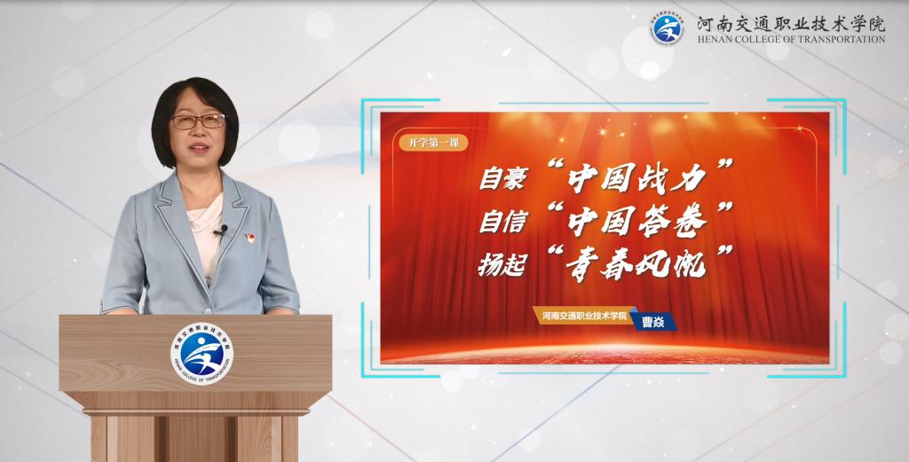 曹焱在第一课上,以《自豪“中国战力”、自信“中国答卷”、扬起“青春风帆”》为题,用详实具体的数据和生动鲜活的案例,引领大家回顾了战“疫”展示的中国力量、中国速度和中国精神;通过全球战“疫”中的中西对比,详细阐述了人民至上执政理念所彰显的中国共产党的人民情怀和责任担当,众志成城的抗疫成果所彰显的中国特色社会主义制度优势,守望相助、同舟共济中所彰显的大国责任和历史担当,有力地激发大家的爱国热忱和民族自豪感、自信心。她希望同学们着眼于当下,做到心中有爱、胸怀家国,眼中有光、砥砺前行,身怀技能、勇担使命;行有所律,居安思危,敬畏自然,珍惜生命,磨炼成才,让青春在党和人民最需要的地方绽放绚丽之花。