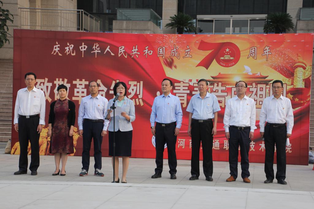 9月30日清晨,学院在新校区广场上举行“致敬革命先烈·青春告白祖国”庆祝新中国成立70周年升旗仪式。党委书记曹焱、院长李强等院领导与教师代表及全体在校生参加了此次升旗仪式,升旗仪式由工会主席张瑞春主持。