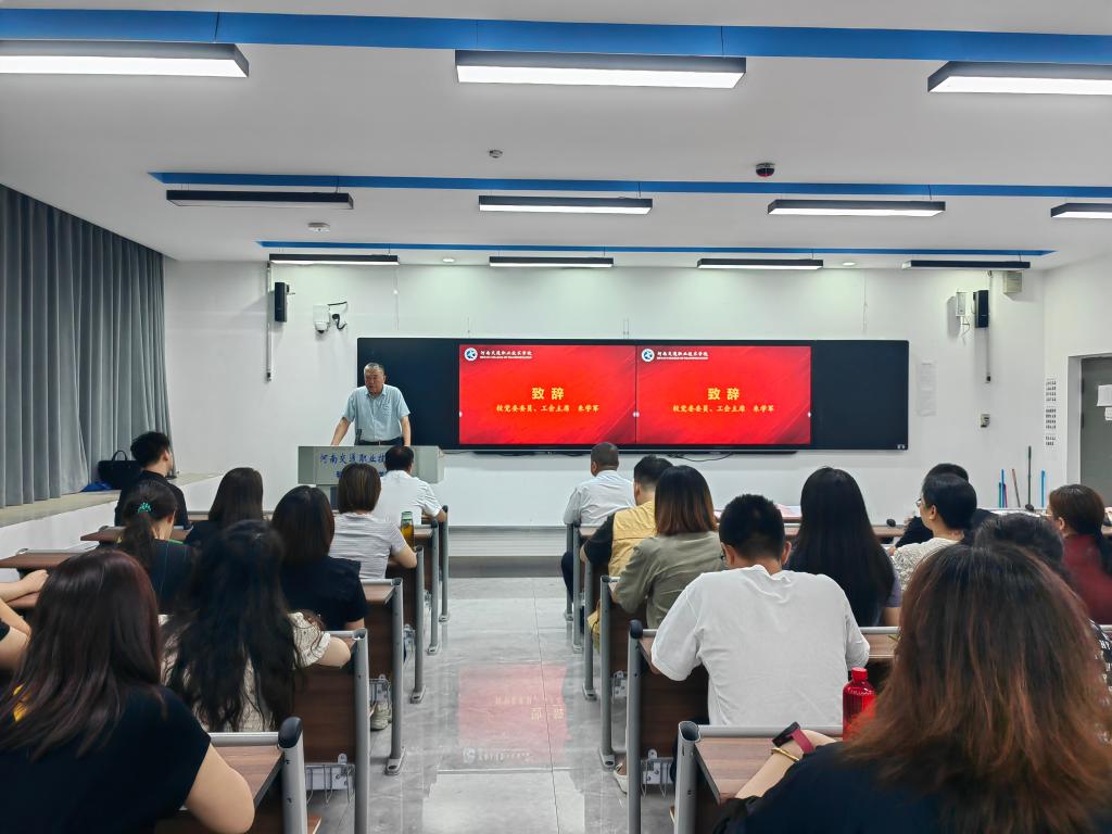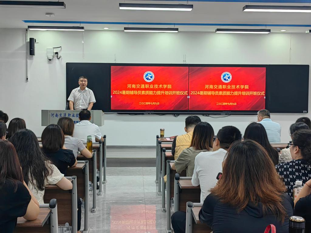 7月9由学生工作部主办,河南交院明德尚行辅导员工作室承办的2024年暑期辅导员素质能力提升培训班在郑东校区举行。工会主席朱学军出席开班仪式并致辞,院()组织员团总支书记、一线辅导员参加开班仪式,开班仪式由学生工作处处长张震主持。