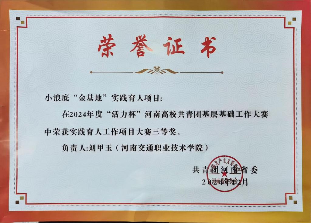近日,2024年度“活力杯”河南高校共青团基层基础工作大赛决赛在河南师范大学举行。学校公路学院报送的小浪底“金基地”实践育人项目在实践育人工作项目大赛中荣获三等奖。