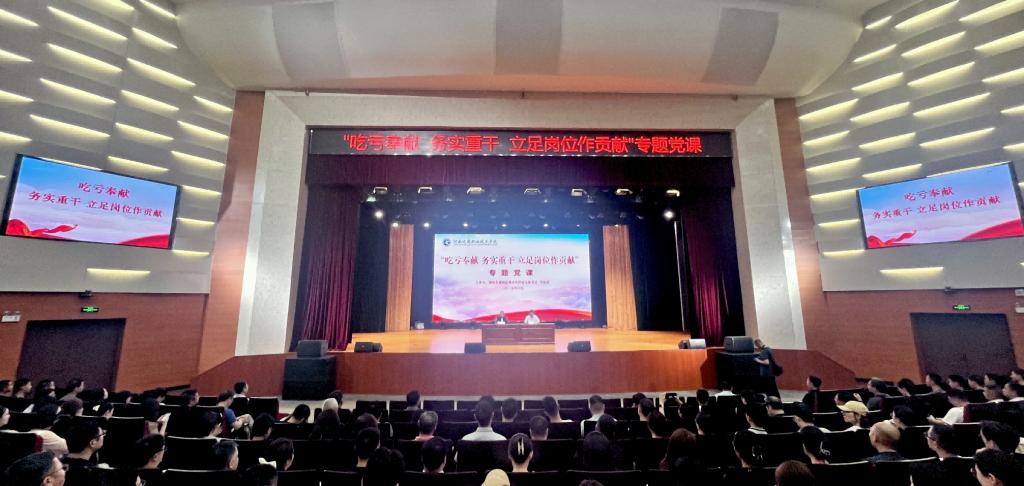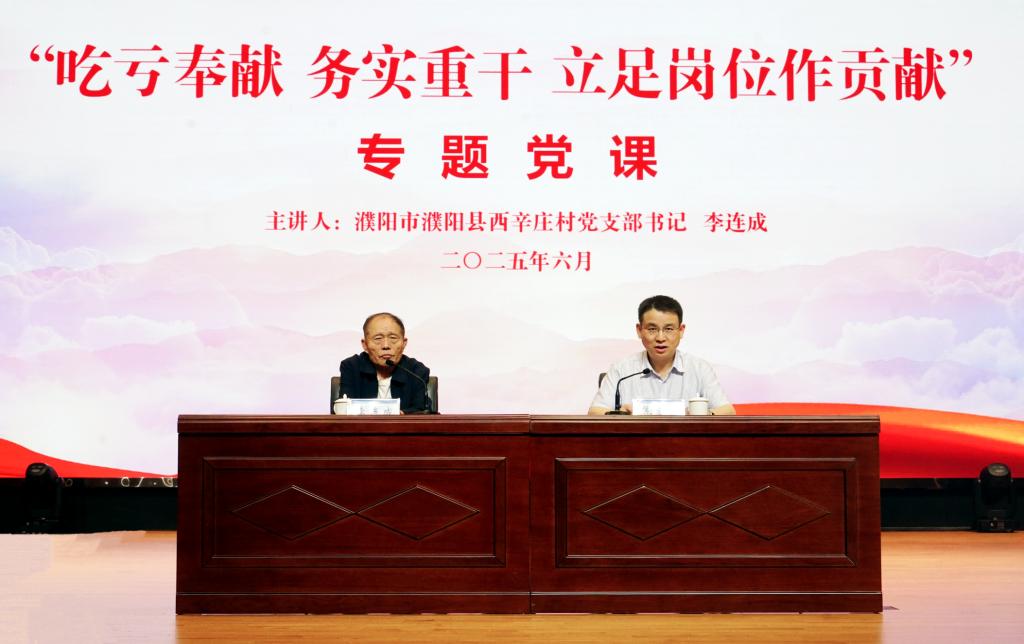 临近“七一”,为教育引导全体党员不忘初心、牢记使命,弘扬艰苦奋斗精神,推动深入贯彻中央八项规定精神学习教育走深走实,6月11日下午,全国优秀共产党员、全国劳动模范、全国人大代表、河南省濮阳县庆祖镇西辛庄村党支部书记李连成应邀来校讲授题为“吃亏奉献、务实重干,立足岗位作贡献”专题党课。专题党课在学校郑东校区文化艺术中心举办,党委副书记、校长焦宏涛主持并讲话。学校领导班子成员、全体党员和全校副科级及以上干部、军士生代表800多人参加。