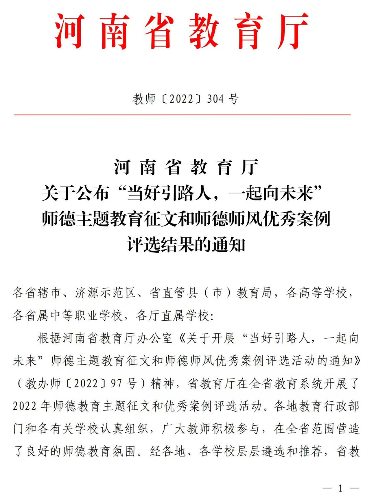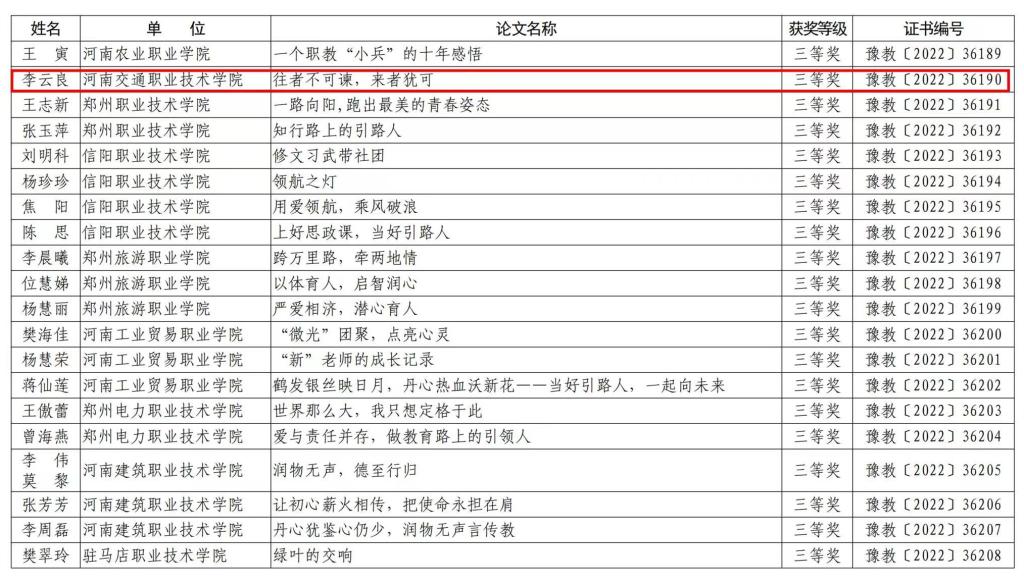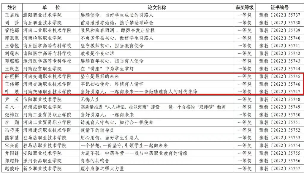 近日,河南省教育厅印发《关于公布“当好引路人,一起向未来”师德主题教育征文和师德师风优秀案例评选结果的通知》(教师〔2022〕304号),我校在师德主题教育征文中有3篇作品获评一等奖、2篇作品获评二等奖、1篇作品获评三等奖,在全省高校中位居前列。