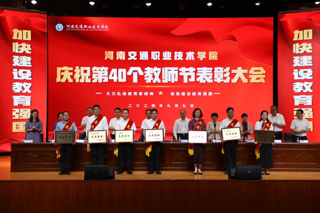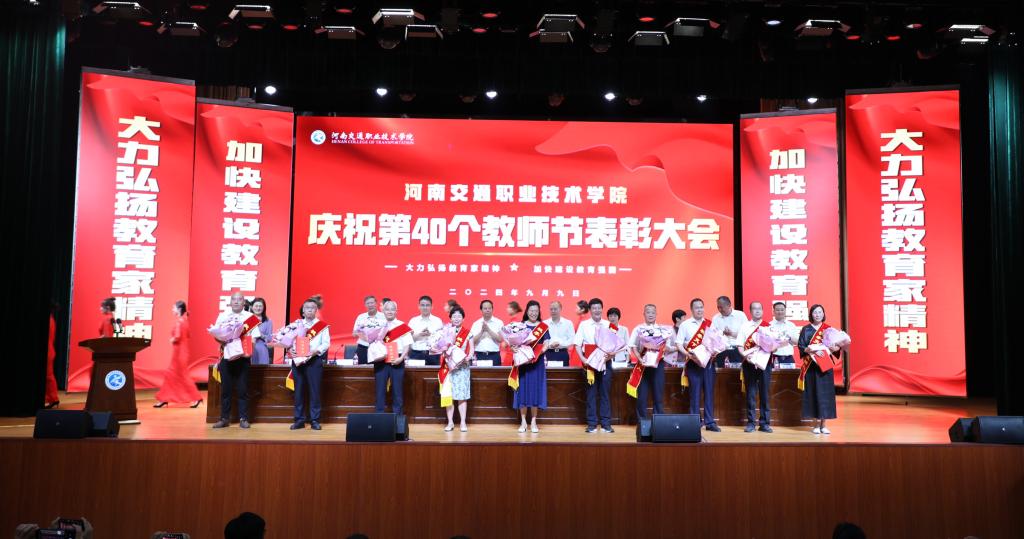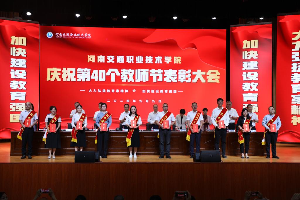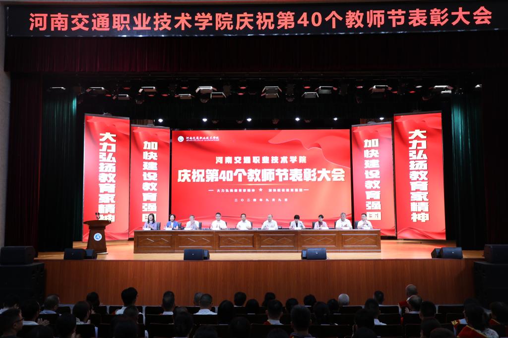 金秋九月,硕果盈枝,9月9日,在第40个教师节即将到来之际,学校在郑东校区文化艺术中心举行庆祝第40个教师节表彰大会。省交通运输厅党组成员、副厅长、一级巡视员唐彦民,省教育厅党组成员、副厅长张传广,河南交通职业技术学院校长焦宏涛出席会议并讲话。全体校领导、教职工及部分学生代表欢聚一堂,共同庆祝第40个教师节。会议由党委副书记李菡主持。