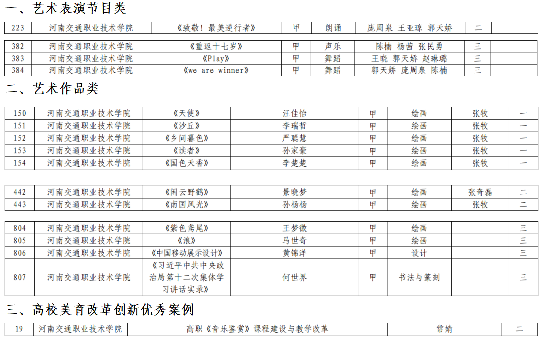 近日,河南省教育厅印发《关于公布河南省第六届大学生艺术展演活动评奖结果的通知》,对全省第六届大学生艺术展演活动的先进单位和优秀作品进行表彰,我校师生共计获得一等奖5项,二等奖4项,三等奖7项的好成绩。