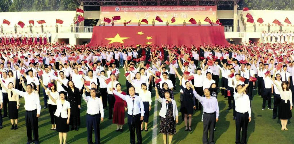五千师生深情告白。活动最后,身着各色服装的五千名同学组成9个方阵,齐聚运动场。现场五星红旗迎风招展,大红灯笼高高悬挂,巨幅国旗映红张张笑脸、照亮颗颗红心,近500名师生组成“70”字样站于方阵中央,七彩方阵织就壮丽画卷,全员师生挥动五星红旗,引吭高歌,共同祝福祖国母亲,现场汇聚成一片欢乐的海洋。在学院党委书记曹焱、院长李强的深情领诵下,五千名师生用心用情齐声祝福伟大的祖国“蒸蒸日上,繁荣富强!祖国万岁!”,向伟大的祖国献上真情告白,数百只和平鸽展翅飞翔,彩色烟雾喷涌而出,现场气氛再次达到高潮。