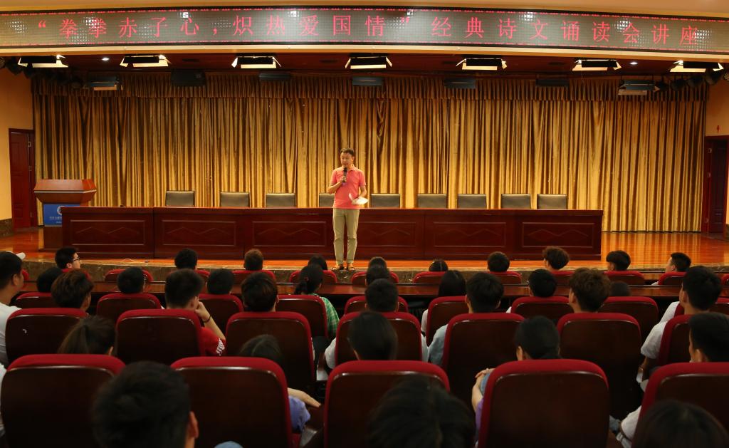 5月27日晚,图书馆在新校区举办了“拳拳赤子心,炽热爱国情”为主题的中华经典诗文朗诵艺术讲座,由商务旅游系老师张亦刚担任主讲人,来自各院系的300余名学生聆听了讲座。